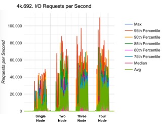 The spikes and dynamic throughput provided indicates more than just lock traffic traversing through the interconnect. As more data is sent and received by nodes, the impact on storage systems also becomes evident.