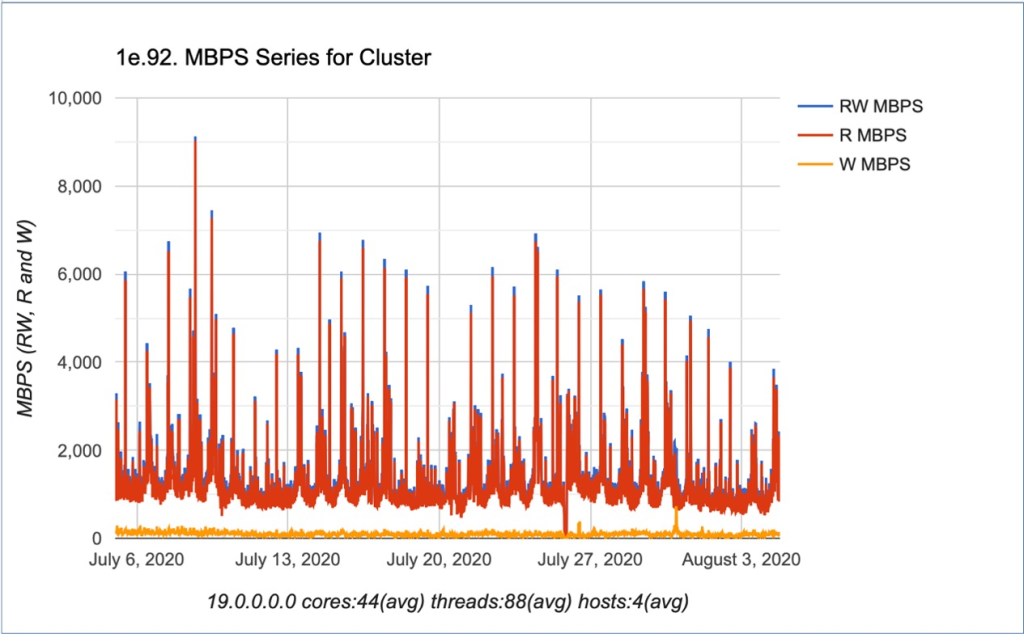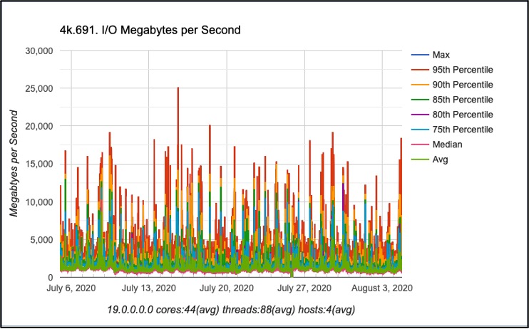 The AWR report for the same system and same timeline above paints a totally different picture of the resource requirements for throughput. The following graph presents the data provided by an AWR report, representing the same 3.5GB/second average, but totally misleading the 15GB/second peak to show a 5 – 8 GB/second throughput requirement. Why is this so misleading? The duration of the AWR report is 30 days and the “collection” reporting interval is limited to minute data points. Therefore, there are less data points presented over a considerable period, represented as a smooth graph on the report.