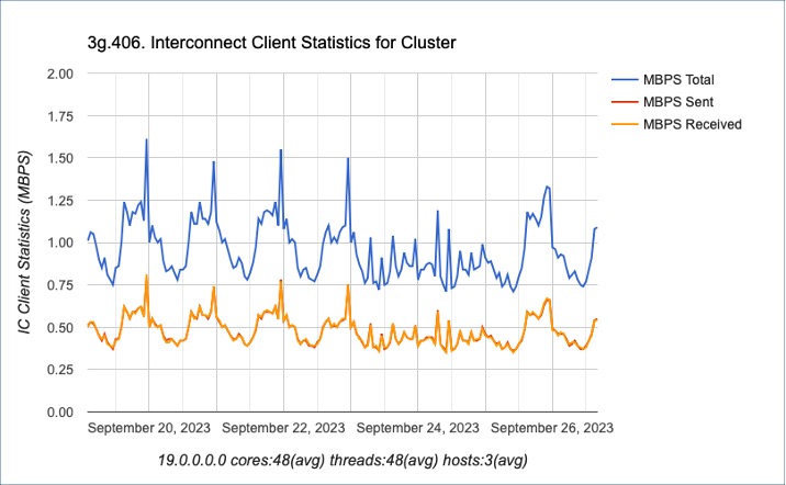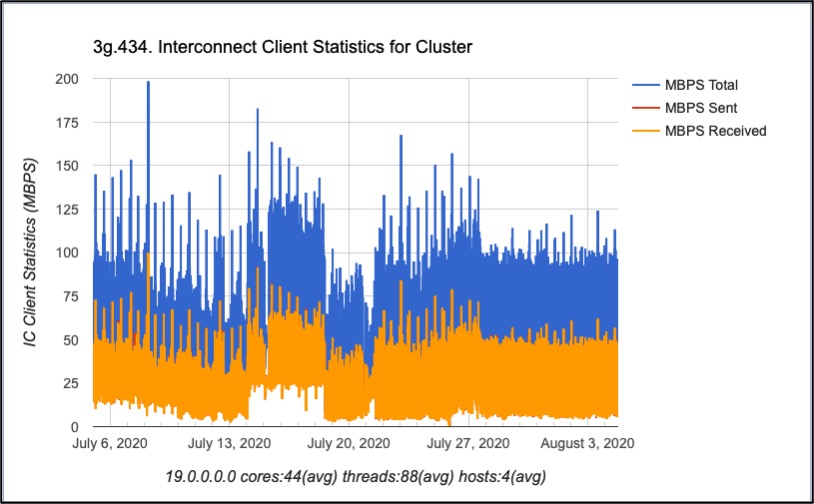 The introduction of InfiniBand for storage and interconnect, the RAC interconnect became a transport for data. Monitoring RAC implementations, there is now more traffic on the interconnect. The following graph presents the interconnect traffic on a half-rack Exadata, which has four (4) compute nodes.