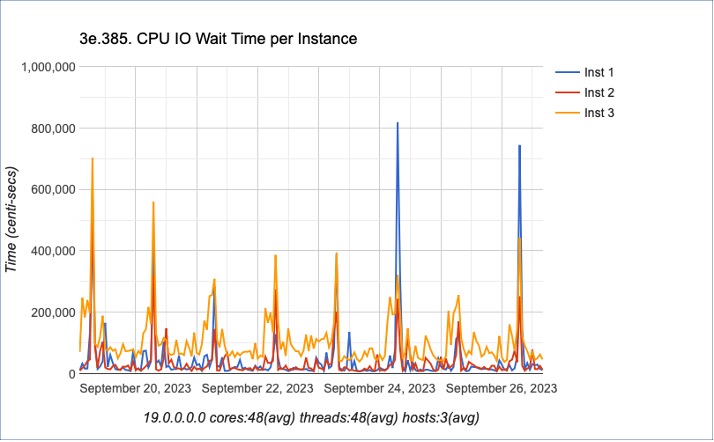 - The environment was experiencing very high IO waits for the number of active sessions. Due to the density of application schemas in multiple databases (small database footprint), the IO wait time spikes are consistent on all databases within the associated cluster – as well as databases on other clusters. [This is a standard consolidation configuration on Oracle, which is not bad – but there are limitations]