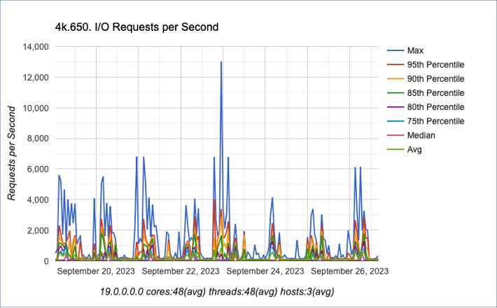 As the following graph presents, the IO requests occur after activity is performed by the interconnect. Some of this is standard locking processes; however, there is additional activity and data traffic that occurs. As you can see, IO activity begins shortly after the interconnect spikes. I will want to investigate it more, but my hypothesis is the interconnect activity occurs first – prior to going to disk. This is consistent with NUMA features and I am making the assumption the cluster process remains consistent.